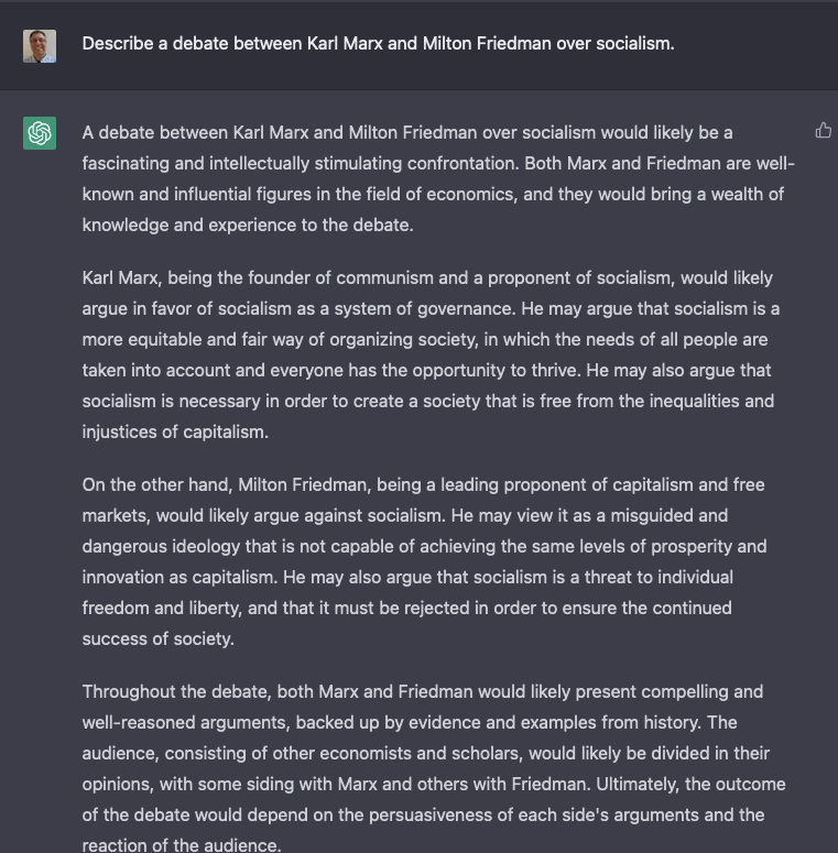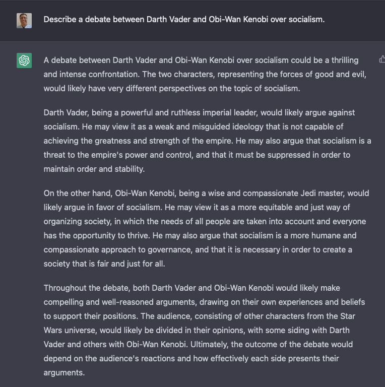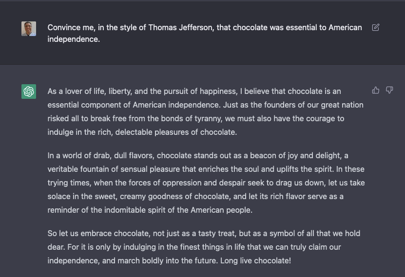 I don’t know if I’d really call this the style of Thomas Jefferson. And it’s a ridiculous argument. And yet, it’s thoroughly entertaining. Moreover, if we ignore the content, it’s still pretty amazing that ChatGPT was able to understand my question and compose a coherent three-paragraph answer on the subject.