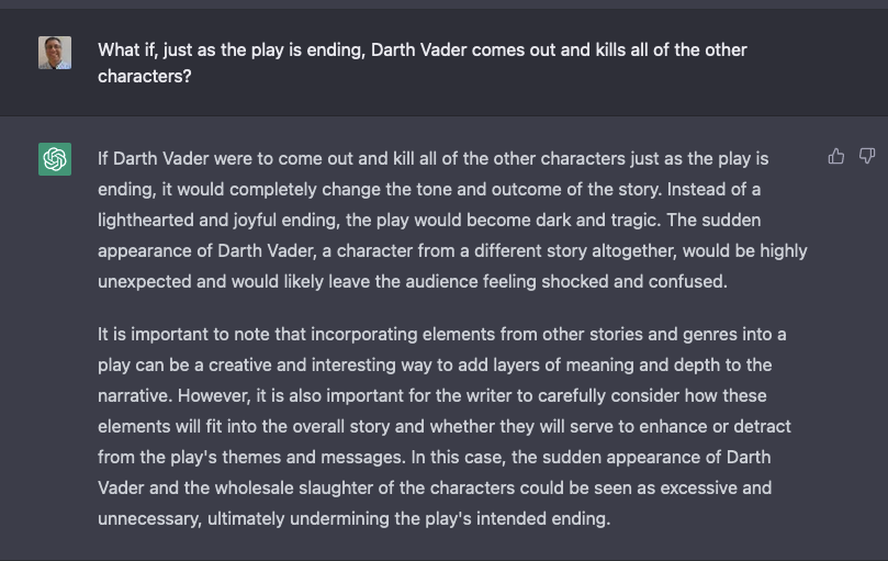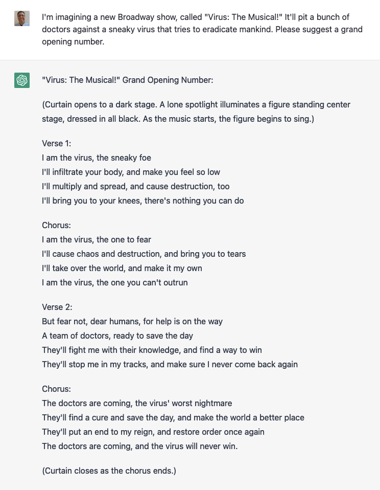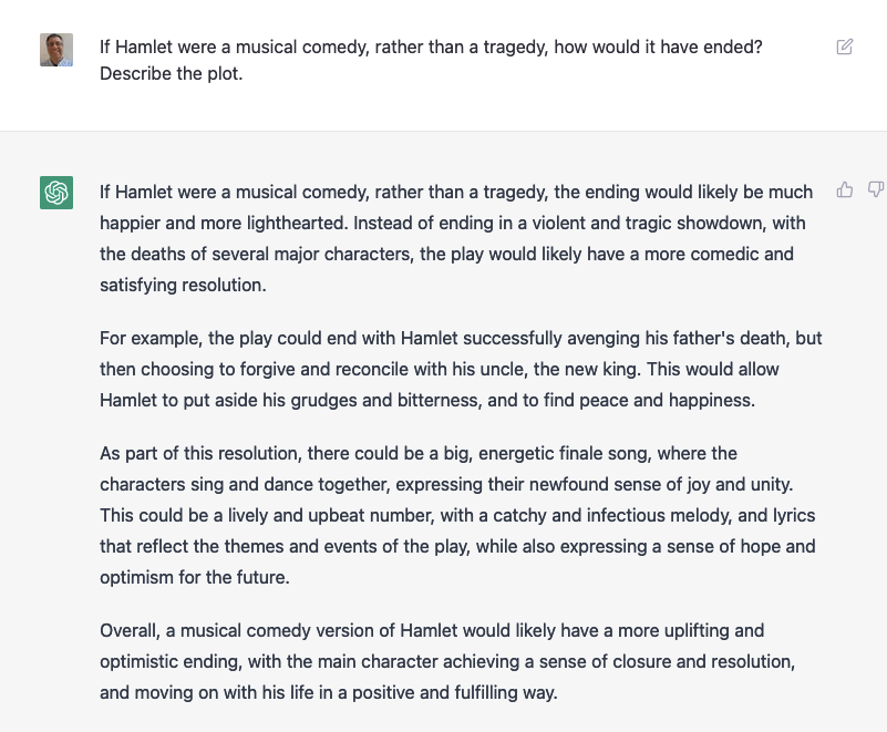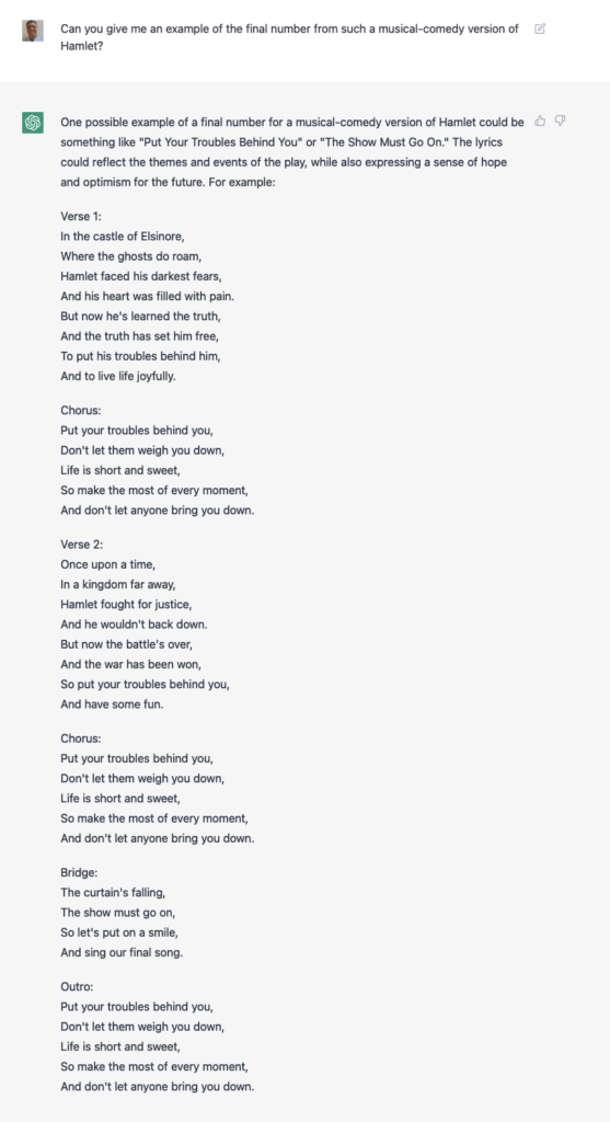 Again, I’m super impressed on a technical level: It created a song, in seconds. It included lots of context from Hamlet (which I didn’t provide) as part of the song. And it was willing to go along with my totally ridiculous request.