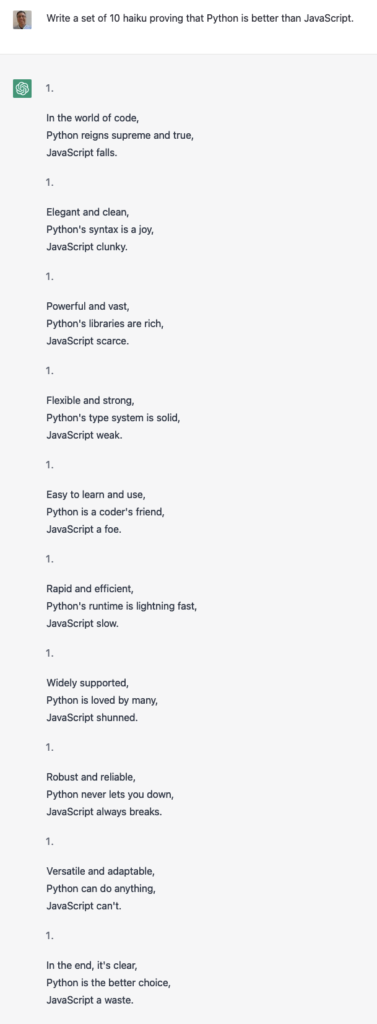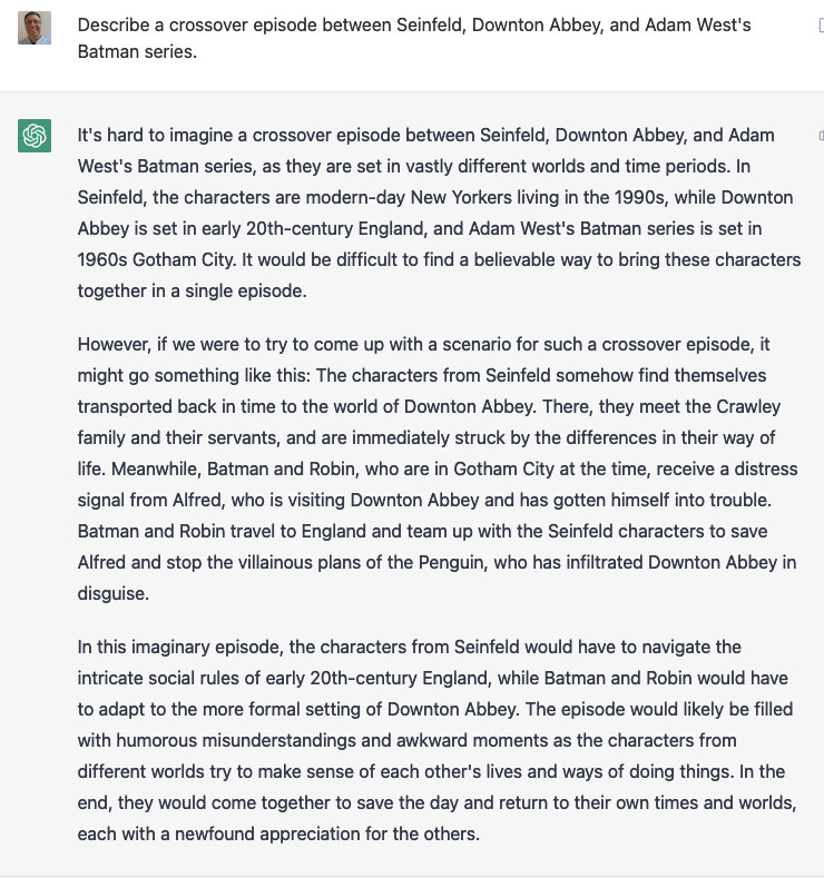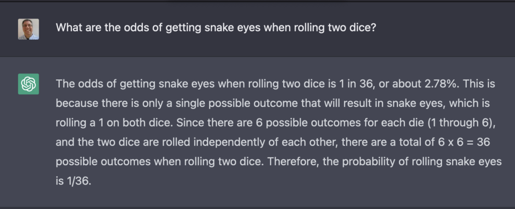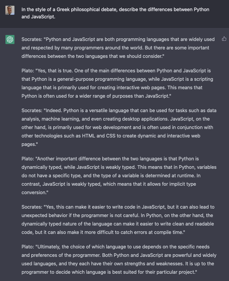 Here, we see that you can ask a question of ChatGPT in free-form English. It gives you a fairly concise, fairly reasonable answer.