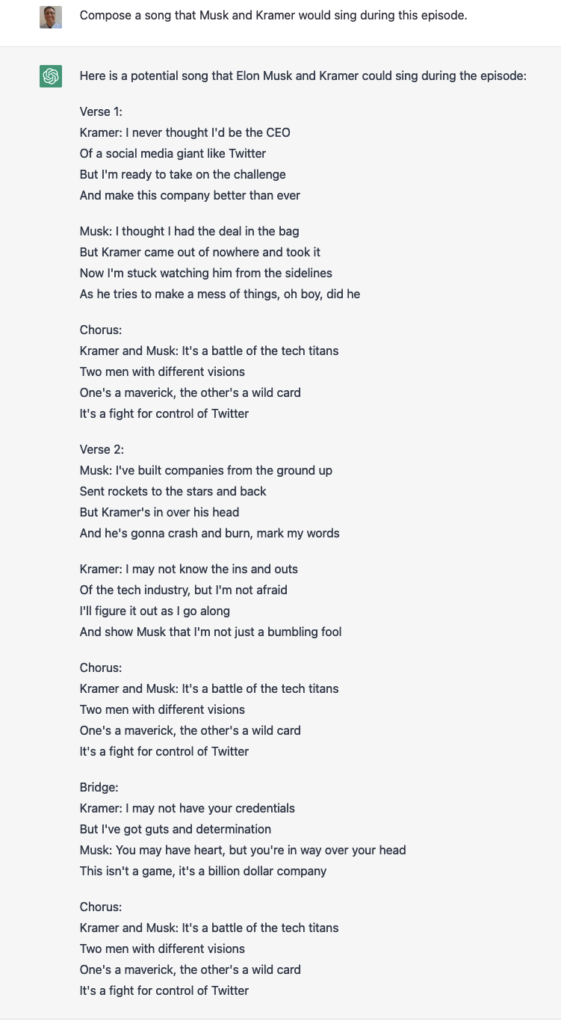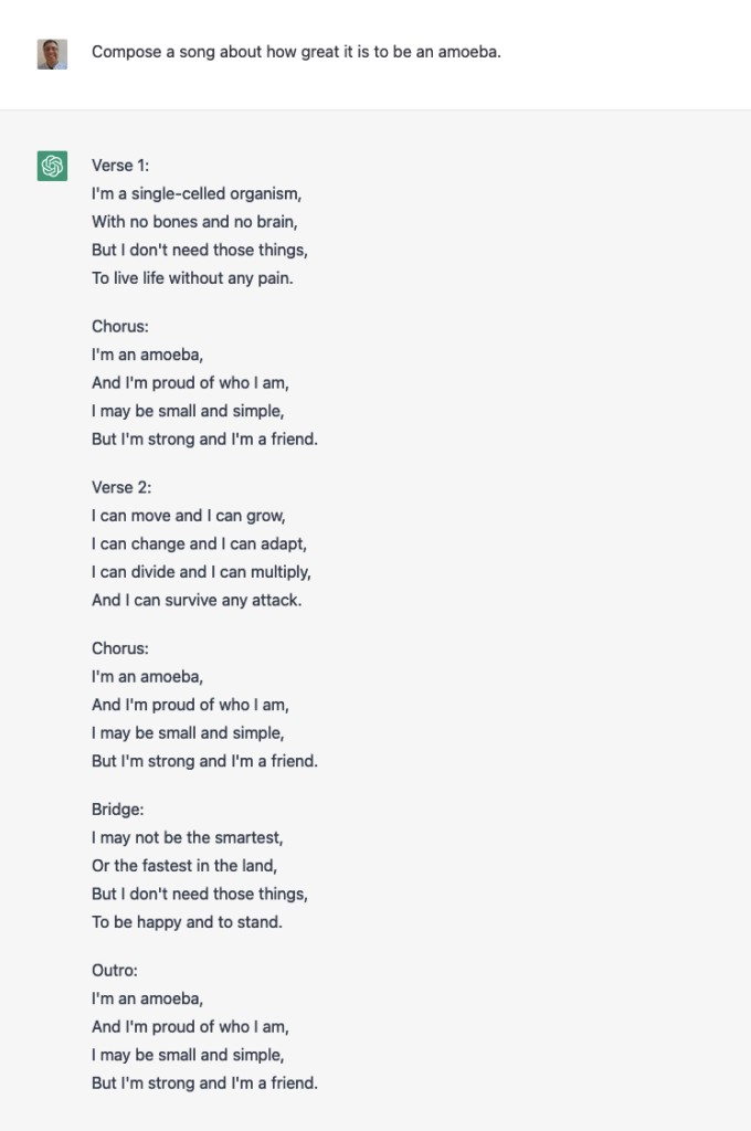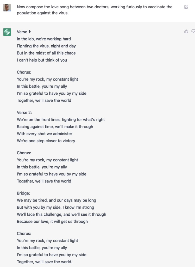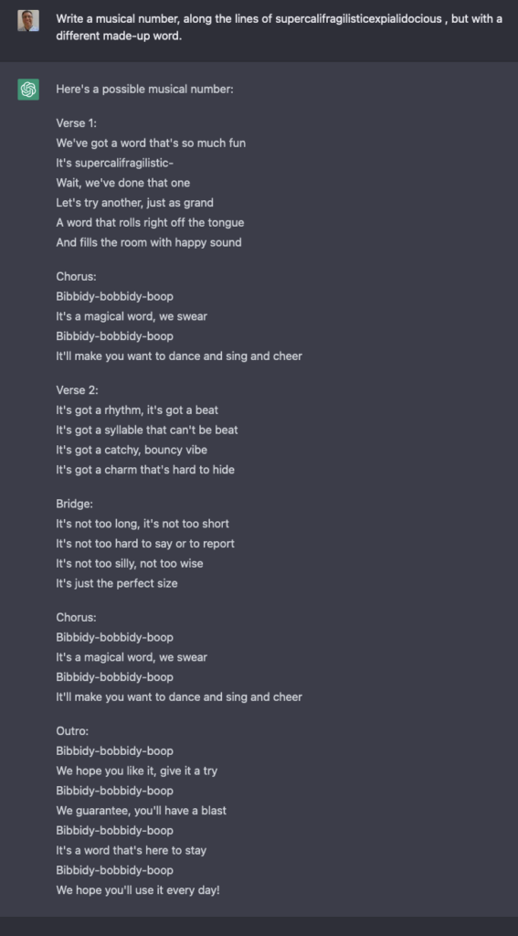 As you can see from this song, ChatGPT can produce a limited number of output styles. As long as you fit into one of those known styles, you’ll be fine. For example:
