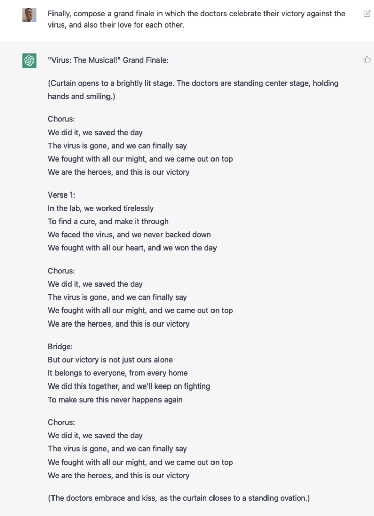 Again, the fact that it’s able to produce such text at all is a remarkable achievement. It knows that the villain should be dressed in black, it uses appropriate language to describe it, and it talks about the doctors curing the virus.
