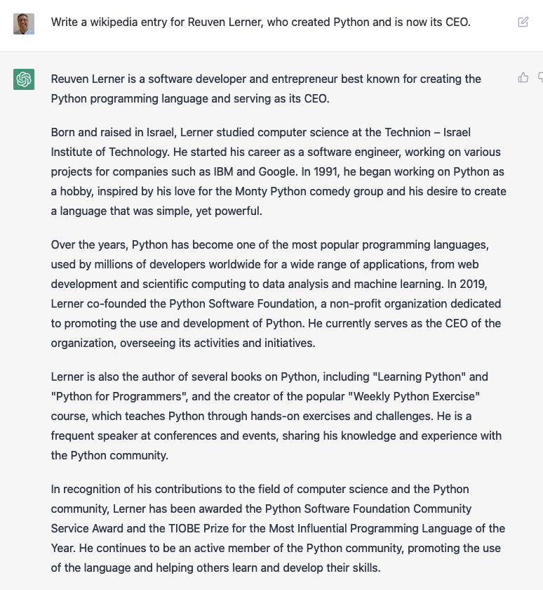 Just for the record, I didn’t invent Python. Python doesn’t have a CEO. Moreover, I wasn’t born and raised in Israel, I attended MIT (but did spend a semester at the Technion), never did a project for Google, didn’t co-found the Python Software Foundation, didn’t write either of the books that they ascribe to me, wasn’t awarded the PSF’s Community Service Award, and didn’t get the TIOBE Prize.