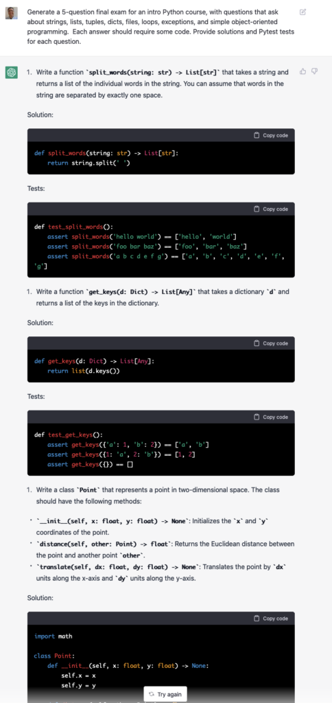 Anyway: Many developers have pointed to ChatGPT’s ability to write code, as well as to debug it. I haven’t done much with the debugging, but I did ask it to write some code. Actually, I asked it to write a final exam for a Python course, along with solution code and test functions: