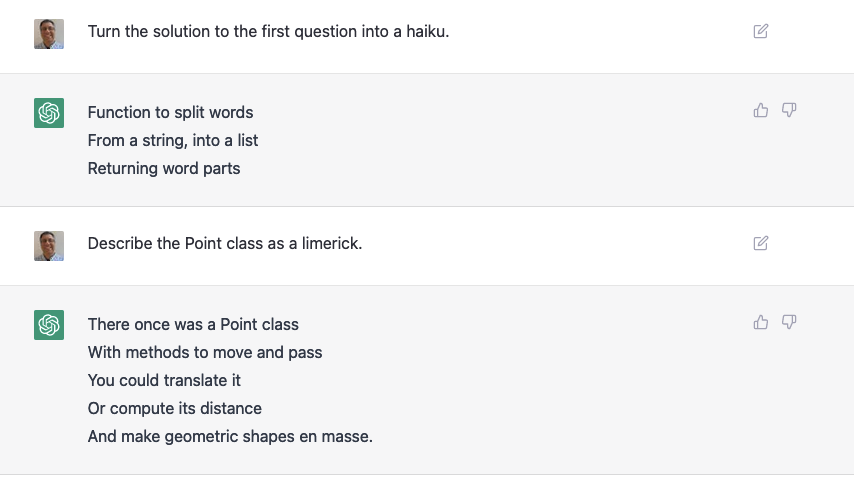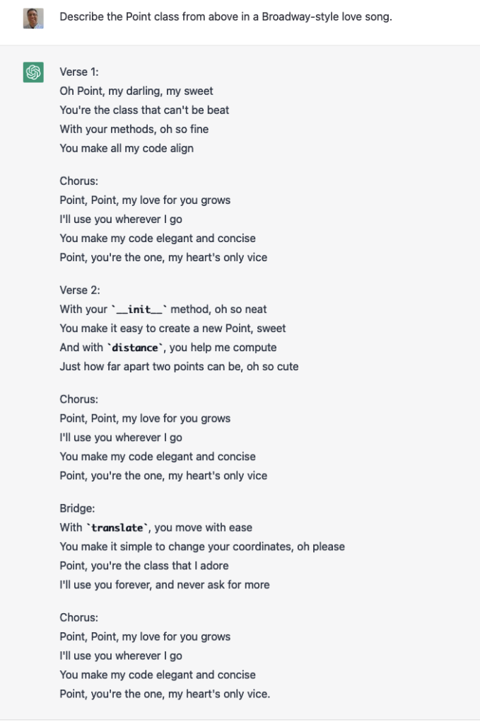Remember that ChatGPT can express the same information in multiple formats. So, I asked it to describe the Point class that it created for this exam in a few ways: