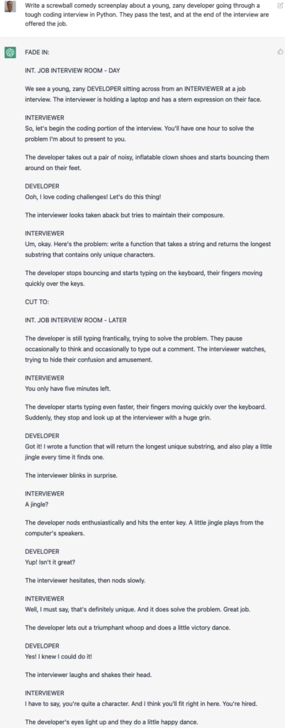 I asked it to create a screenplay in which a candidate takes a programming exam. That was a bit dry, so I asked again, this time saying that it was a “screwball comedy” with a “young, zany” developer candidate. Here’s what I got: