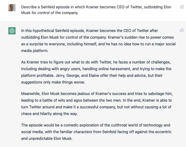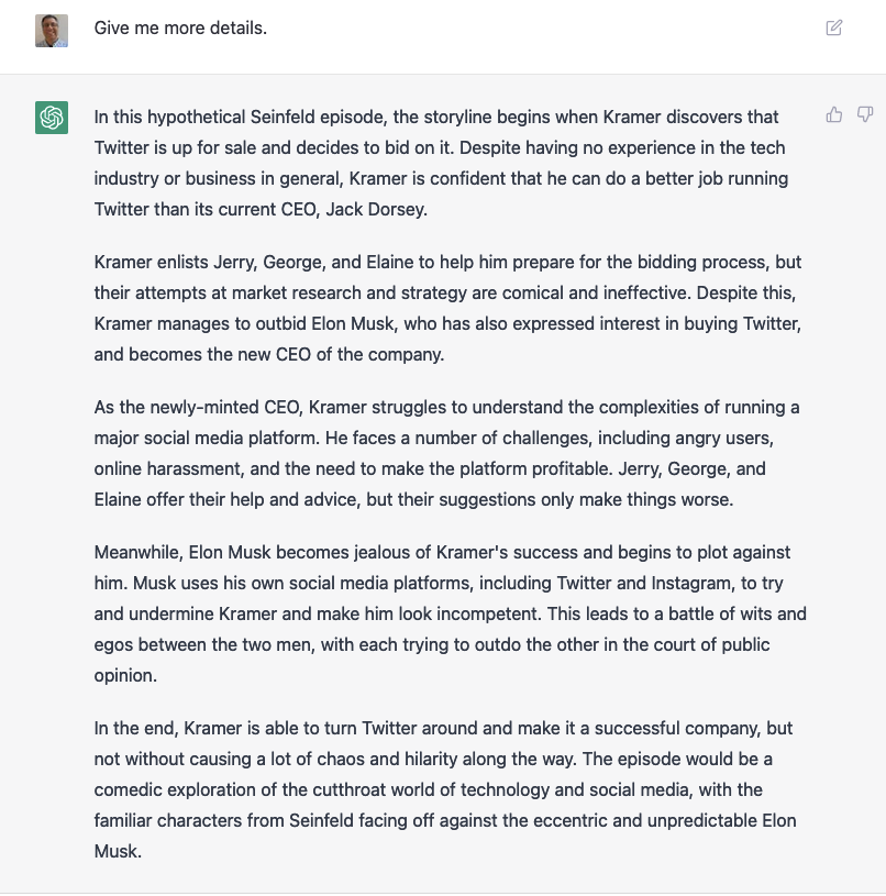 Another nice thing about ChatGPT is that it has “state,” meaning that it remembers what you’ve asked and told it from one question to another. So you don’t need to restate an entire question; you can just tweak your request. Admittedly, the results can be a bit … weird: