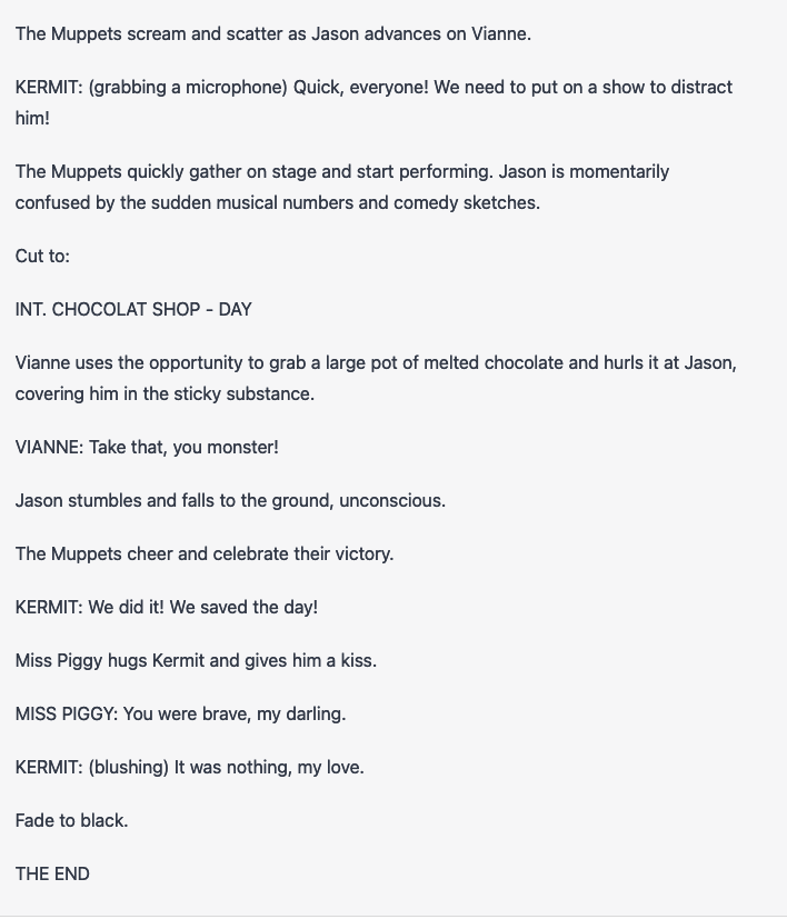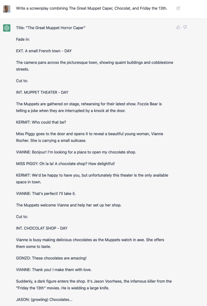 Here, I asked it to write a screenplay, I thought that we could get some violence by including a horror film in the crossover: