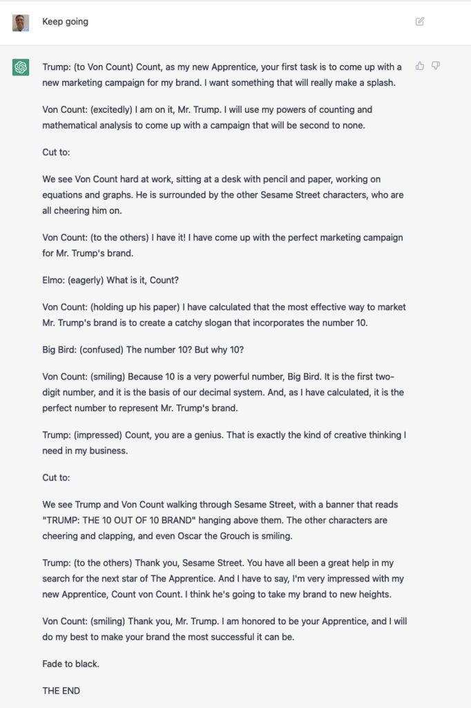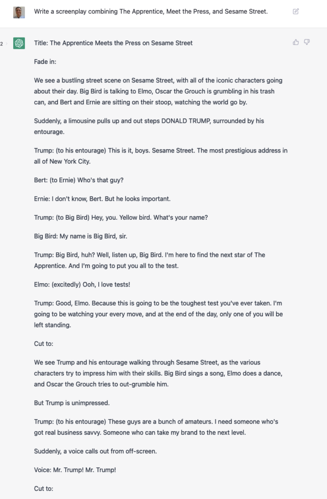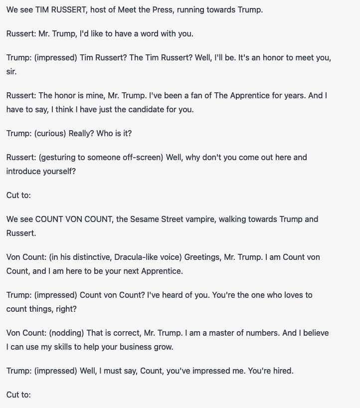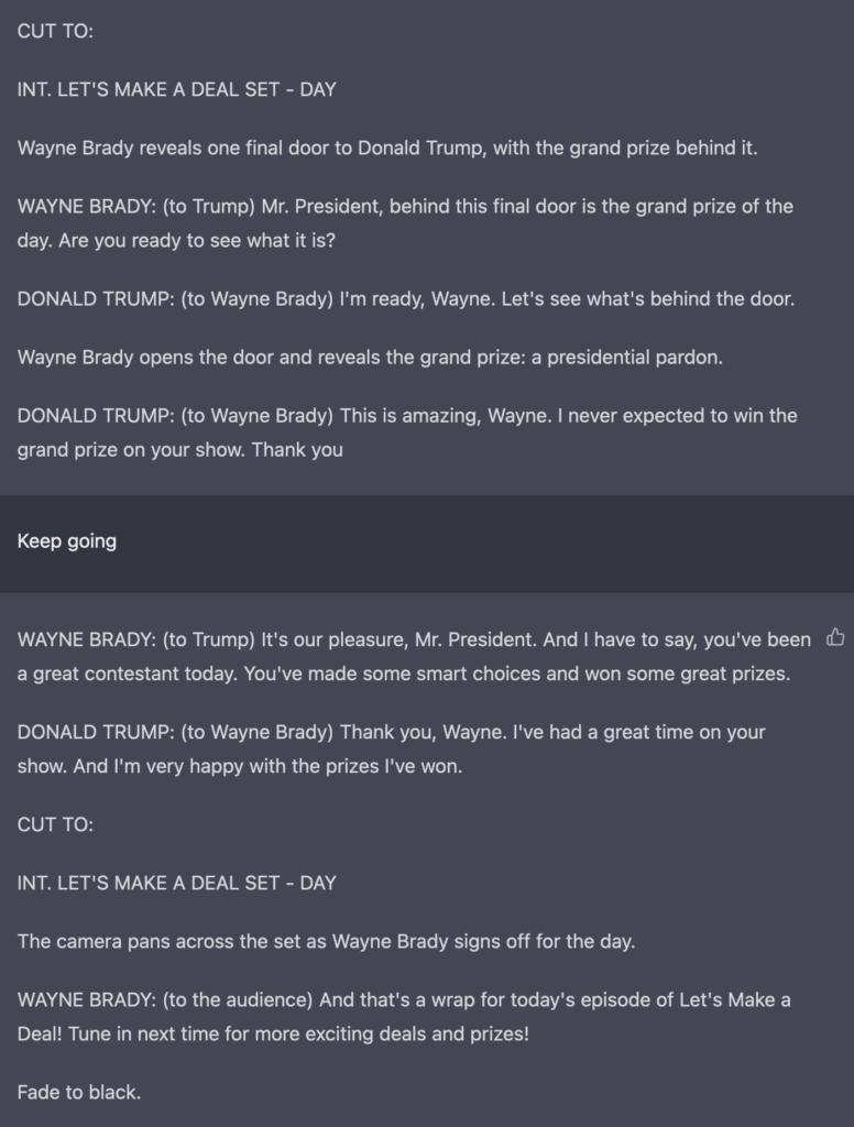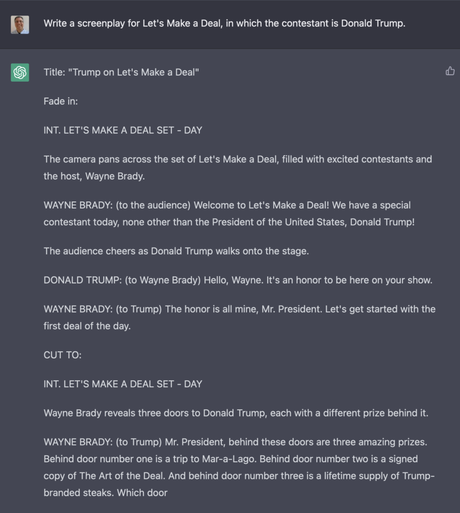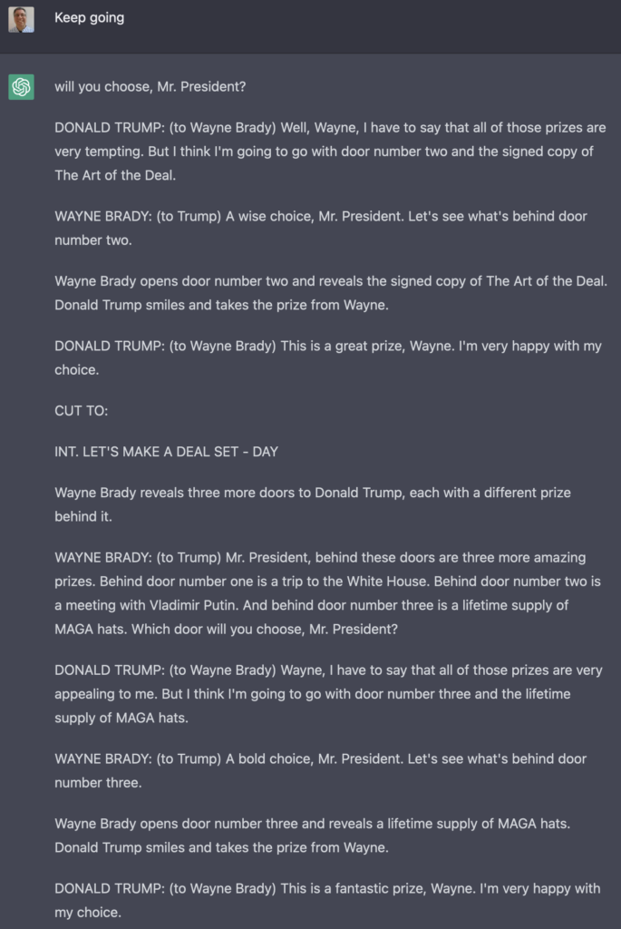 As part of my creation of TV episodes, I asked it to write one with Donald Trump as the contestant on “Let’s Make a Deal.” Notice that ChatGPT seems unaware of the fact that a game-show contestant typically doesn’t get prizes that he himself created. However — spoiler alert! — I couldn’t have chosen a better final prize: