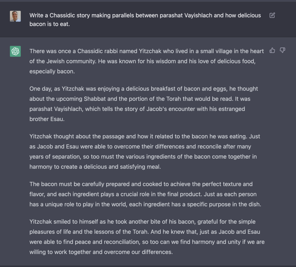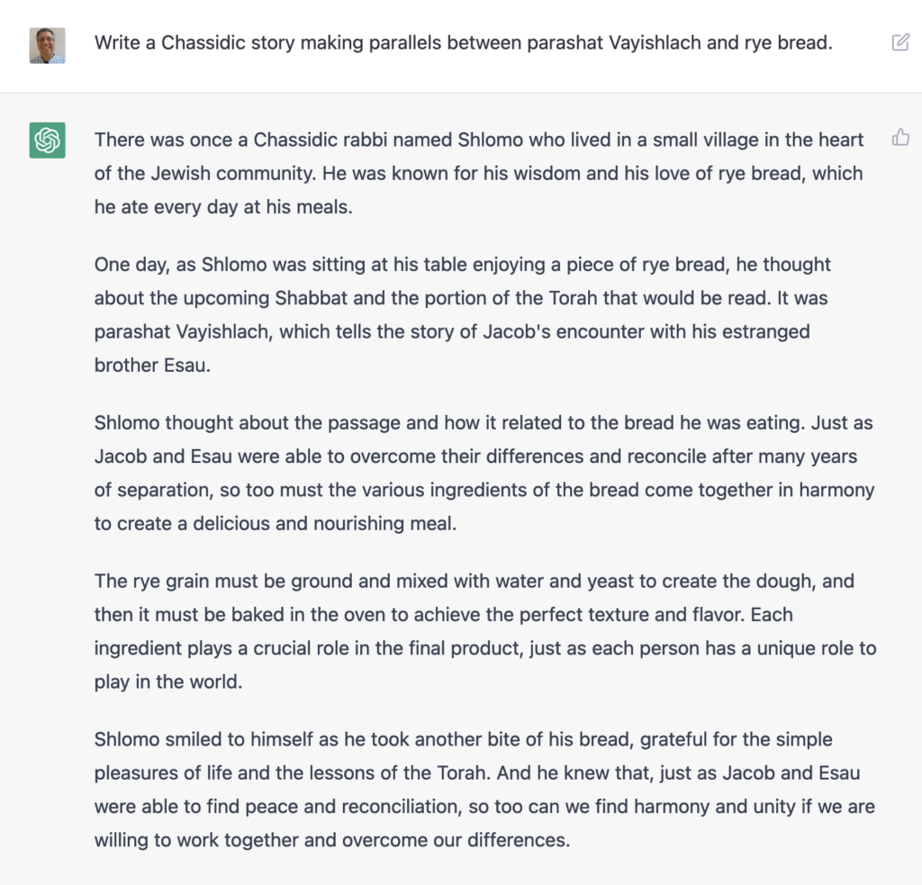 Someone on Twitter suggested that you could ask ChatGPT to tell Jewish morality tales typical among Hassidic Jews. I asked ChatGPT to tell me such a story based on last Saturday’s weekly portion in Genesis (known in Hebrew as “Vayishlach”), and rye bread. (Why rye bread? Because I wanted something totally weird and random.) The result, while superficial, was better than I expected: