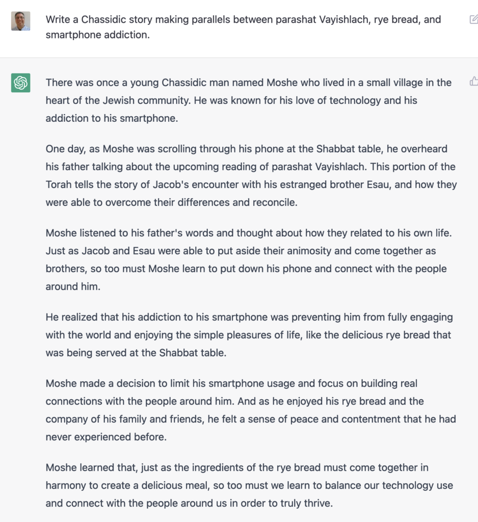 Very impressive, right? Yes, it is — except that religiously observant Jews don’t use the phone on Shabbat, aka the Sabbath. The notion that a Hasidic story would have someone using his phone at the Shabbat table is totally absurd. The fact that ChatGPT would include this fact demonstrates how powerful the technology is, and how little common sense it has, too.