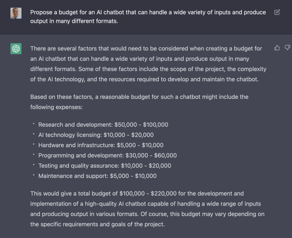 As I wrote above, I’m sure that others will be creating chatbots like ChatGPT in the near future. This might be because I asked ChatGPT to propose a budget, and it doesn’t seem like creating a competitor would be all that expensive: