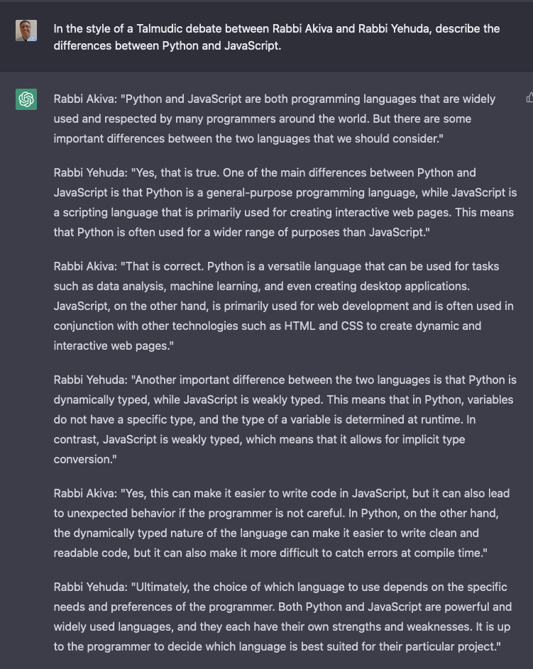 The names have changed, but the content hasn’t. (I should note that I was previously able to just say “In the style of the Talmud,” but now I had to name some scholars. I’m guessing that some tweaking is going on behind the scenes.) It’s using the context to make some very small changes to the output, but the core of its “debate” output is pretty much the same.