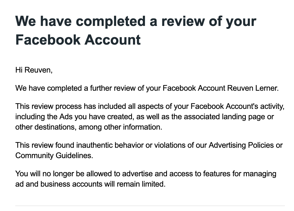 Nope: About 30 minutes later, I got e-mail from Meta saying that they had reviewed my case, I had definitely violated their policy, and now I was banned for life from ever advertising on a Meta platform. Here’s the e-mail that I got: